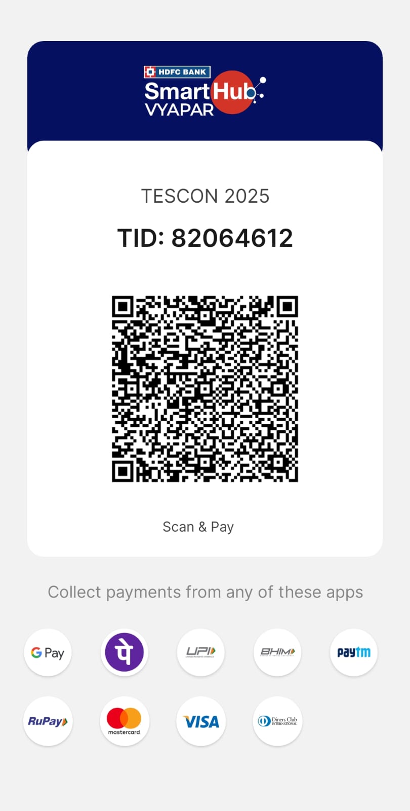 Greetings from TESCON 2025. Please scan the QR with cards and UPI to complete your payment.